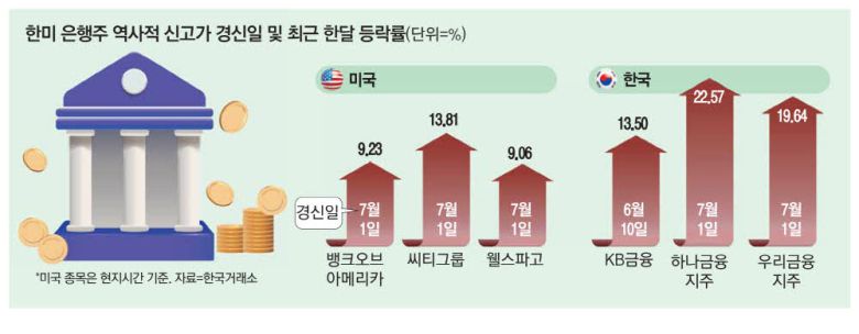 주주환원 매력에 힘입은 한국과 미국의 은행주들이 최근 최고가 경신 행진을 이어가고 있다.