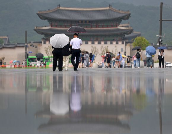 비가 내린 가운데 서울 광화문광장에 고인 빗물 위로 광화문과 우산을 쓴 시민의 모습이 비치고 있다. [사진=연합뉴스] |