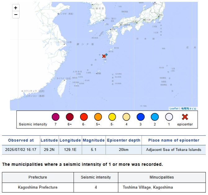 일본 기상청 누리집 등에 따르면 도카라 열도 해역에서는 이날 오전 4시 32분 규모 5.0의 지진이 발생했으며 진도 5약의 흔들림이 감지됐다.