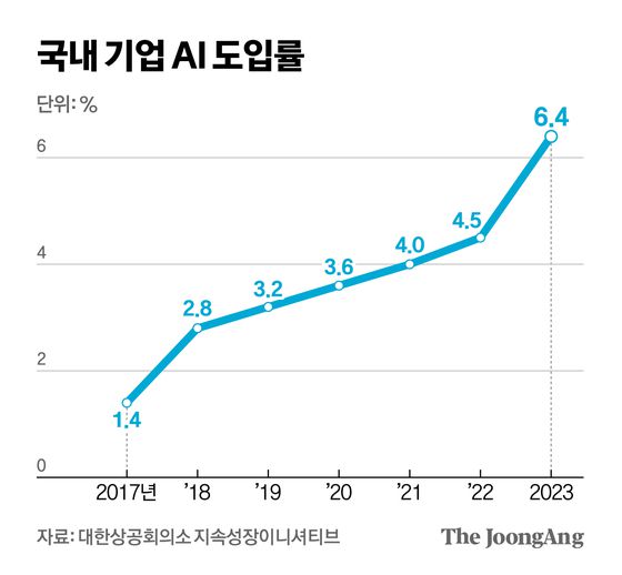 전통적인 사업영역 상으로 경쟁할 일이 없었던 이들 기업이 AX 시장에 모여든 이유는 성장 가능성이 크기 때문이다. 대한상공회의소 지속성장이니셔티브(SGI)가 지난달 8일 발표한 ‘AI 도입이 기업 성과 및 생산성에 미치는 영향 및 시사점’ 보고서에 따르면 국내 전체 기업의 AI 도입률은 2023년 기준 6.4%로, 2.8%였던 2018년보다 크게 늘었다. 보고서는 “한국은 제조업 비율이 높아 아직 서유럽 국가 등 해외와 비교해 상대적으로 산업에 AI를 도입한 비율이 낮다”며 향후 성장가능성을 높게 평가했다. 시장분석 기관 IDC코리아도 지난 1월 “2025년 국내 조직의 60%가 특정 비즈니스 기능을 위해 개발된 기업용 AI 에이전트(비서)를 활용할 것”이라는 전망을 내놨다.