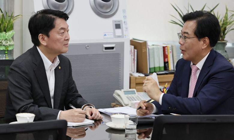 野 쇄신 어떻게… 국민의힘 송언석 비상대책위원장 겸 원내대표(오른쪽)와 당 혁신위원장에 내정된 안철수 의원이 2일 오후 국회 본청 원내대표실에서 만나 대화를 나누고 있다. 허정호 선임기자