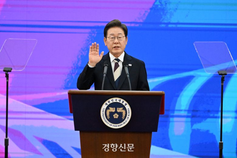 이재명 대통령이 지난달 4일 국회 로텐더홀에서 열린 제21대 대한민국 대통령 취임 선서를 하고 있다. 박민규 선임기자 |