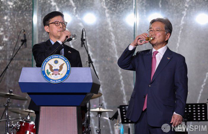 [서울=뉴스핌] 사진공동취재단 = 조셉 윤 주한 미국대사대리와 박윤주 외교부 1차관이 2일 오후 서울 용산구 그랜드 하얏트 호텔 그랜드 볼룸에서 열린 미국 독립기념일 행사에서 샴페인을 마시고 있다. 2025.07.02 photo@newspim.com