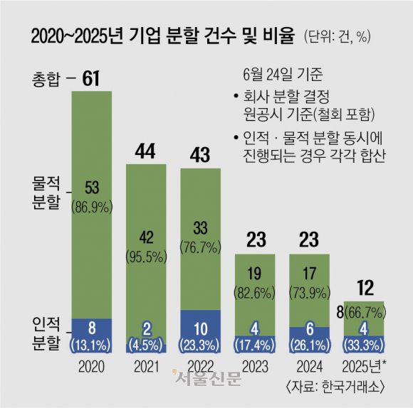 2일 한국거래소에 따르면 2020년부터 지난달 24일까지 기업 분할 공시는 총 206건으로 이 중 172건(83.5%)이 물적분할이었다. 인적분할은 34건에 그쳤다. 연도별로 보면 증시가 활황이던 2020년과 2021년에는 각각 86.9%, 95.5%로 물적분할 비중이 특히 높았다. 이후 2022년(76.7%), 2023년(82.6%), 2024년(73.9%), 그리고 2025년 상반기(66.7%)에도 물적분할 비중은 여전히 높은 수준을 유지했다.