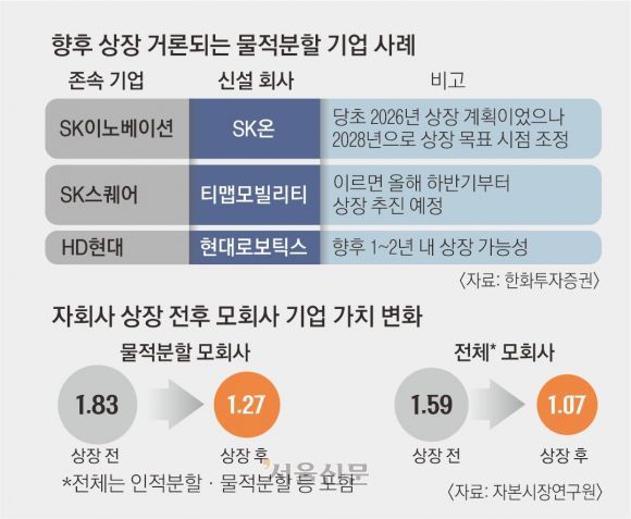 최근에는 이재명 정부의 상법 개정 움직임과 맞물려 아예 상장을 철회하는 사례도 나타나고 있다. SK이노베이션은 지난달 25일 상장을 추진하던 자회사 SK엔무브의 지분 30%를 다시 매입해 완전 자회사로 전환했다. SK엔무브는 윤활유 부문을 물적분할해 설립된 회사로 네 차례 기업공개(IPO)를 시도했지만 사업 중복성과 핵심 자회사라는 이유로 쪼개기 상장, 중복 상장 논란이 지속돼 왔다.