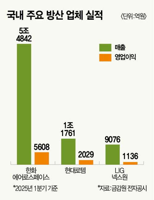 금융정보 업체 에프앤가이드에 따르면 한화에어로스페이스, 현대로템, LIG넥스원, 한국항공우주산업(KAI) 등 국내 주요 방산 업체 4곳의 올 2분기 영업이익 컨센서스(시장 평균 전망치)는 1조805억원으로 집계됐다. 전년 동기(5950억원) 대비 82%가량 증가한 수치다.