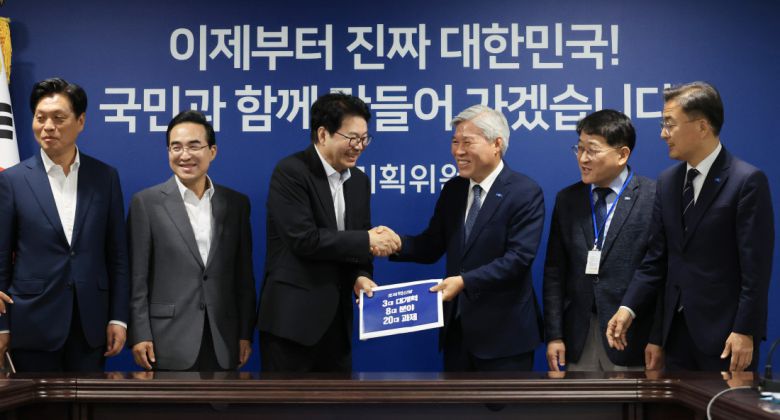 국정기획위에 ‘정책과제’ 전달 이한주 국정기획위원장(왼쪽에서 세번째)이 2일 서울 종로구 국정기획위원회에서 서왕진 조국혁신당 원내대표(네번째)로부터 정책과제를 전달받고 있다. 연합뉴스 |