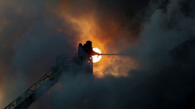 ▲ 러시아 드론이 공격한 우크라이나 자포리자에서 화재 진압하는 소방관
