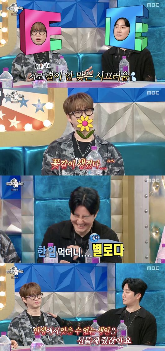이날 김구라는 타블로와 투컷에게 “23년째 서로 씹으면서 브로맨스 유지 중이라고?”라고 물었다. 타블로는 “재밌게 하려고 투닥투닥거리는 게 아니라 실제로 투닥거린다. 저랑 많이 다르다. 성격이 저는 완전 F고, 얘는 완전 T다. 둘다 E라서 시끄럽지만 다르게 부딪힌다. 미쓰라진 중개 역할로 좋게 포장하지만 빠져있다. 둘이 많이 좀 티격태격한다”라고 밝혔다.