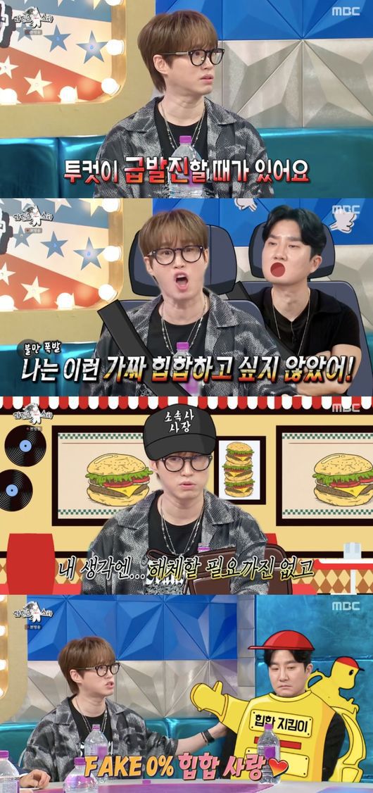 이어 “불만 있으면 얘기하라고 했는데 뒷자석에서 제 의자를 뒤로 발로 빡 차면서 ‘나는 이런 가짜 힙합하고 싶지 않았다’고 하더라”라고 했고, 실제로 투컷은 해체 선언까지 했다고 밝혔다.