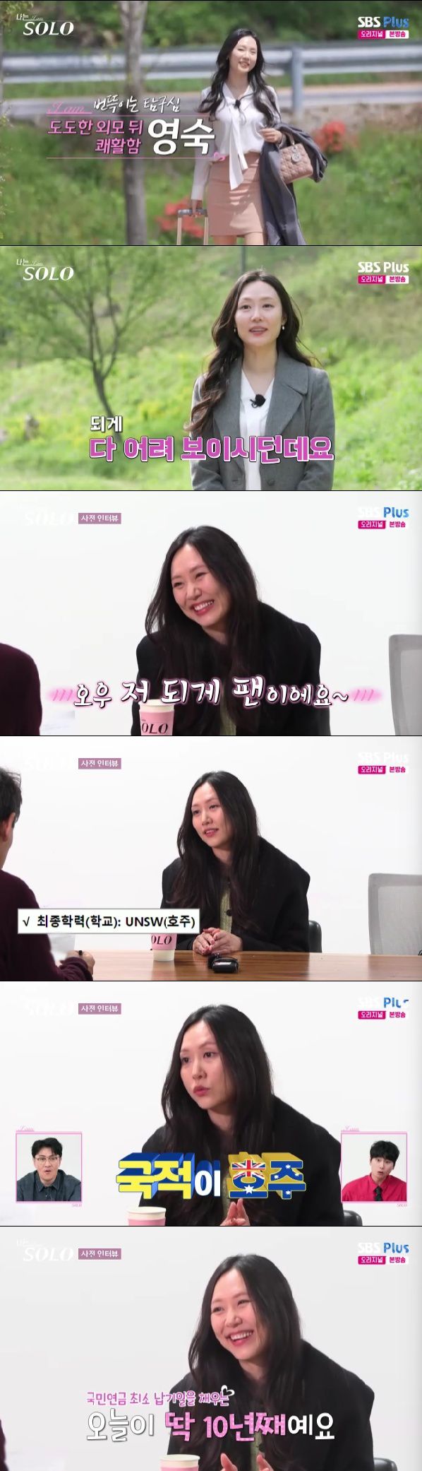 호주 UNSW 출신인 영숙은 "가족이 전체 다 이민을 갔고 국적이 호주다. 가족들은 호주에 있고 나만 10년 전에 와서 일하고 있다. 이전에는 미국계 회사에 다니다가 동종 외국계 회사로 이직했다. 오늘로서 국민연금 최소 납기일을 채웠다"라며 웃었다.
