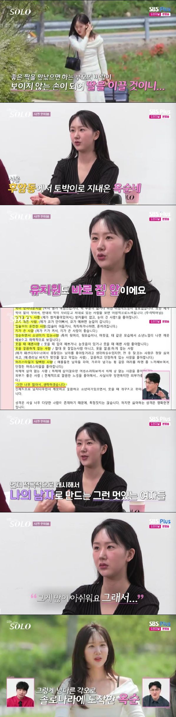 순자는 "외면뿐만 아니라 내면도 아름답다. 사랑받고 자란 티난다는 말을 많이 들었다. 아빠가 굉장히 사랑꾼이다. 엄마가 있는 대구로 이주했다. 결혼이 준비된 사람을 만나고 싶다. 좋은 엄마가 되고 싶어 요리를 해야할 것 같아 한식도 배웠다. 가족에게 건강한 밥을 해주고 싶다. 원래 사과도 못 깎았다. 그래서 해야겠다고 싶었다"라고 이야기했다.