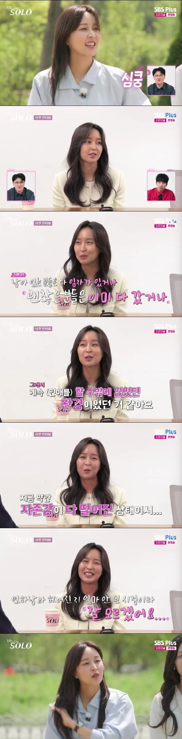 정숙은 "연애는 많이 했다. 공대다 보니 기회가 있었다. 끊임없이 할 수밖에 없던 환경이었다"라면서도 "자존감이 떨어진 상태다. 24기 옥순님처럼 답변할 수 있을 것 같은데 지금 연하남에게 데여서 자존감이 낮아져서 될까 이런 상태다. 잘 모르겠다. 잘 웃고 리액션 좋은 게 장점 같다"고 말했다.