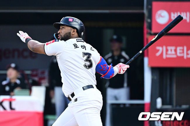 로하스는 2일 수원 KT위즈파크에서 열린 ‘2025 신한은행 SOL Bank KBO리그’ 키움 히어로즈와의 경기에 5번 지명타자로 선발출장해 4타수 1안타 2타점을 기록했다. 4회말 1사 만루에서 2타점 2루타를 터뜨리며 이날 경기 결승타의 주인공이 됐다.