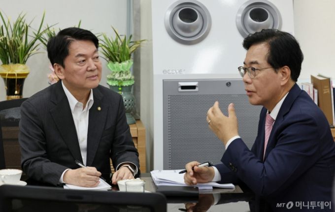 [서울=뉴시스] 고승민 기자 = 송언석(오른쪽) 국민의힘 비대위원장과 안철수 혁신위원장이 2일 서울 여의도 국회 국민의힘 원내대표실에서 만나 면담을 하고 있다. (공동취재) 2025.07.02. photo@newsis.com /사진=김호웅 |