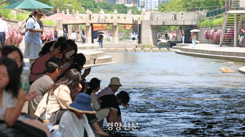 무더운 날씨에 서울 청계천을 찾은 시민들이 발을 물에 담그고 있다. 정효진 기자 |