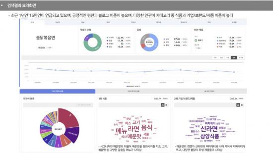 뉴엔AI의 '퀘타아이' 서비스에 '불닭볶음면'을 검색한 결과. 지난 1년 동안 불닭볶음면이 언급된 게시물 수를 채널별로 보여주고, 연관어와 평판 등을 분석해 소비자의 성향을 파악할 수 있다. |