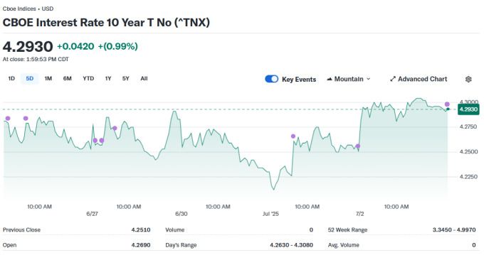 이날 미국 10년 만기 국채 수익률은 전장 대비 4.2bp(1bp=0.01%포인트) 상승한 4.291%로, 6월 13일 이후 가장 큰 일일 상승폭을 기록했다. 2년물 수익률은 1.2bp 오른 3.787%, 30년물은 4.3bp 상승한 4.821%에 각각 거래됐다.