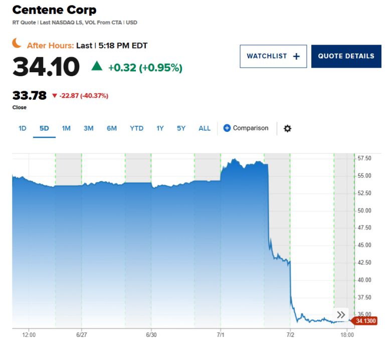 보험사 센테네는 전 거래일 대비 40.35% 폭락한 33.78달러에 마감했다. 연간 가이던스를 철회한 것이 큰 충격을 줬다.