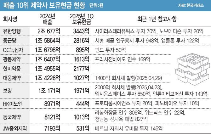 한 바이오 VC 심사역의 말이다. 미국에서 빅파마가 바이오텍 인수로 생태계 선순환을 일으키는 것처럼, 국내에서도 제약사가 나서줄 수 있을까. 최근 펀딩 혹한기로 몸값이 대폭 축소된 바이오텍이 속출하는 것은 주목할 만한 지점이다. 이들을 M&A 하는 데에 투입할 현금과 니즈가 있는 제약사가 있을지 이데일리는 매출 10위 제약사의 현금보유 수준과 최근 투자 영역을 점검해 봤다.