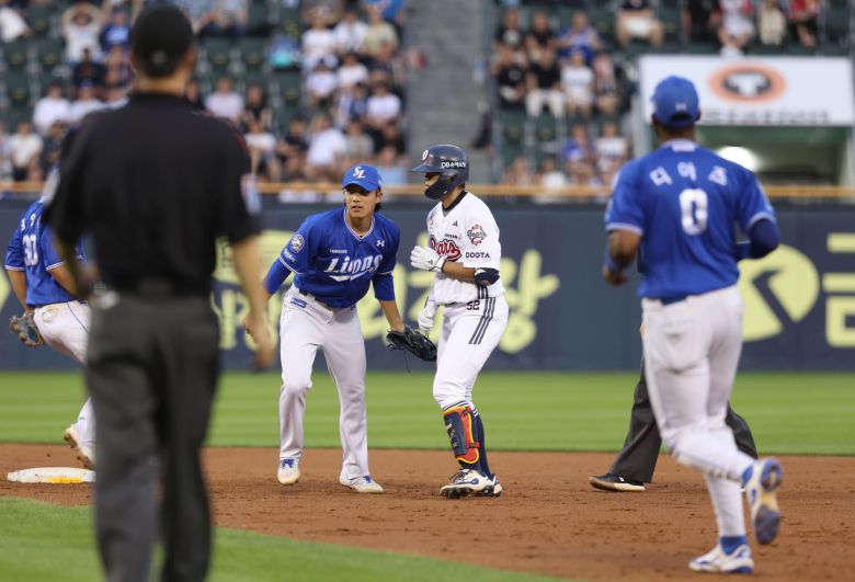 삼성은 선두타자 김지찬의 볼넷, 희생번트를 시도한 김성윤까지 야수선택으로 출루에 성공하며 무사 1, 2루 기회를 맞았다. 이후 구자욱이 2루수 땅볼로 주자들을 한 베이스씩 전진시켰고, 디아즈가 고의4구로 걸어 나가며 1사 만루가 됐다. 그러나 끝내 득점으로 이어지지 않았다. 후속타자 강민호와 김영웅이 바뀐 투수 박치국을 상대로 연속 헛스윙 삼진으로 물러나며 허무하게 이닝이 마무리됐다.