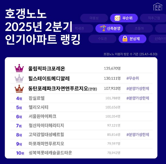 직방이 운영하는 아파트 종합 정보 플랫폼 호갱노노는 이같은 결과를 담은 '2025년 2분기 인기 아파트 랭킹'을 3일 공개했다.