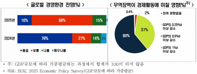 BIAC는 "지속되는 보호무역주의 확산과 무역장벽이 세계 경제 전반에 구조적 리스크로 작용하고 있다"며 "이는 기업들의 체감경기와 투자심리를 급속히 위축시키고 있다"고 분석했다.