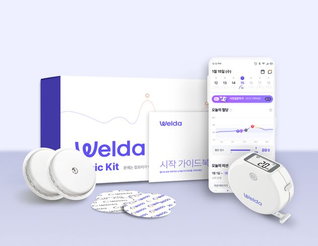 대웅 혈당 관리 솔루션 '웰다' 키트 구성과 앱 연동 화면(사진=대웅) |