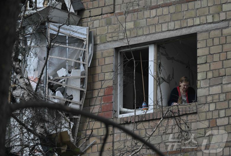 6월 23일(현지 시간) 한 여성이 러시아의 우크라이나 키이우 공습으로 파손된 건물 안에 서 있다. 이날 러시아가 밤새 우크라이나 전역에 드론 352기, 미사일 16기를 발사하면서 키이우와 인근 지역에서만 최소 7명이 사망했다. 2025.06.23 ⓒ AFP=뉴스1 ⓒ News1 윤다정 기자
