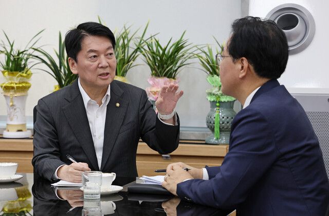 국민의힘 송언석 비상대책위원장 겸 원내대표가 2일 서울 여의도 국회에서 혁신위원장으로 내정된 안철수 의원과 회동하고 있다. 공동취재사진 |