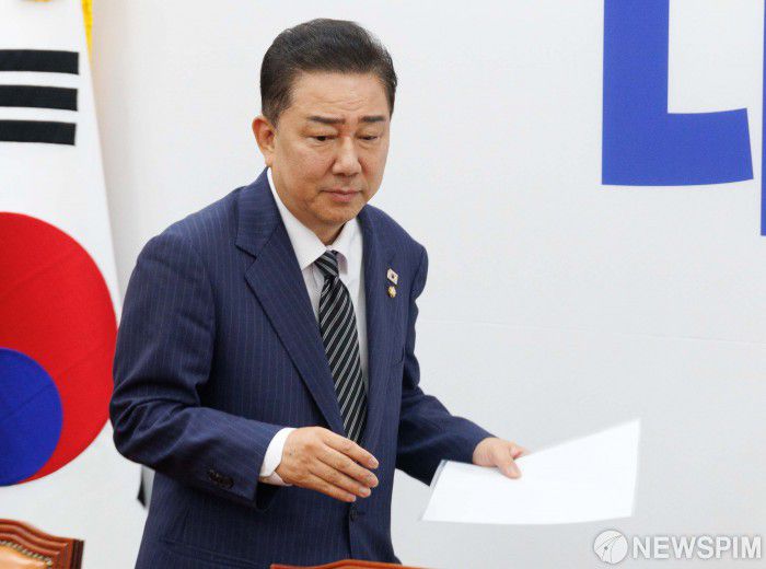 [서울=뉴스핌] 윤창빈 기자 = 김병기 더불어민주당 대표 직무대행 겸 원내대표가 3일 오전 서울 여의도 국회에서 열린 정잭조정회의에 참석하고 있다. 2025.07.03 pangbin@newspim.com |
