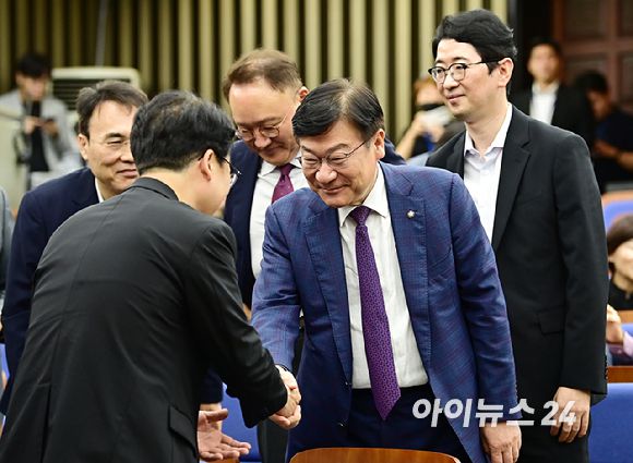 3일 국민의힘 사무총장에 선임된 정점식 전 정책위의장이 지난해 8월 의원총회에서 동료의원들과 인사하고 있다.[사진=곽영래 기자] |