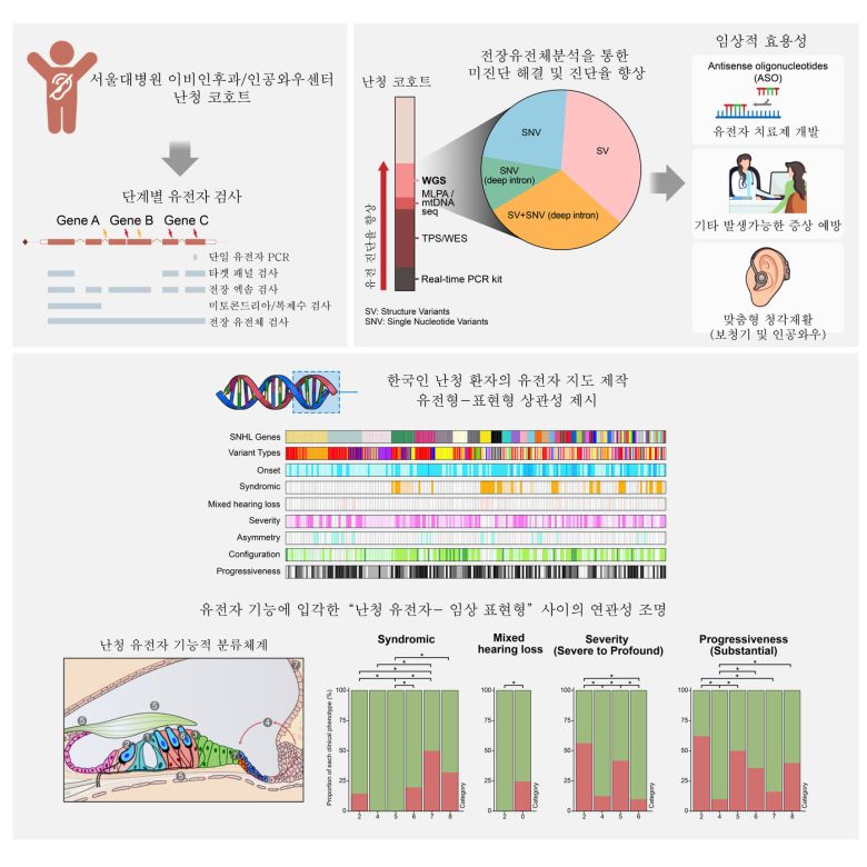 감각신경성 난청 유전자 분석 과정 요약: 전장유전체분석을 통해 한국인의 난청 유전자 지도를 구축하고, 비코딩 및 구조적 변이와 난청 유형의 관계를 분석함(서울대병원 제공) |