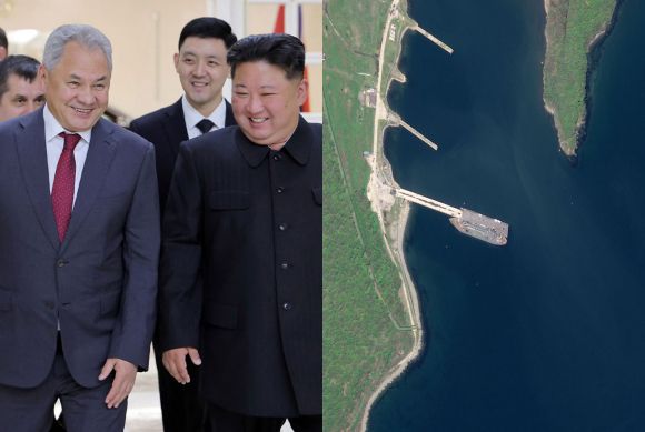 세르게이 쇼이구 러시아 국가안보회의 서기와 김정은 북한 국무위원장(왼쪽), 위성사진에는 지난해 북한군을 실어 나른 선박과 같은 유형의 수송선이 지난 5월 18일(현지시간) 러시아 블라디보스토크 인근 두나이 군항에 도착했다. 출처=KCNA·오픈소스 센터 에어버스 |