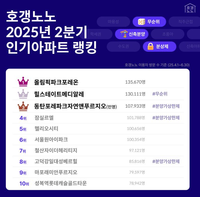 [서울=뉴스핌] 송현도 기자 = 아파트 종합 정보 플랫폼 호갱노노가 '2025년 2분기 인기 아파트 랭킹'을 3일 공개했다. 무순위 청약이나 분양가상한제가 적용돼 가격 경쟁력을 갖춘 신축 대단지에 수요자들의 관심이 집중된 것으로 나타났다.