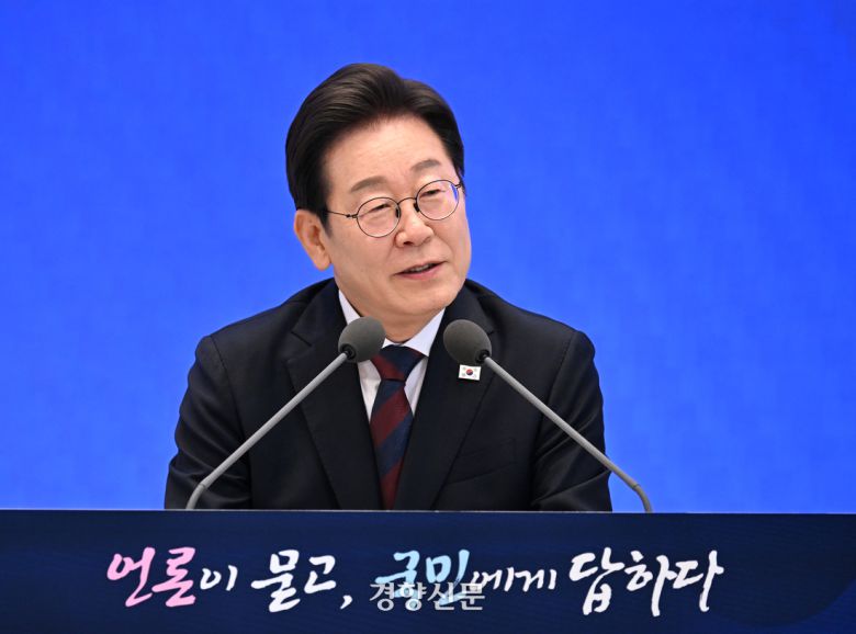 이재명 대통령이 3일 서울 종로구 청와대 영빈관에서 열린 취임 첫 공식 기자회견 ‘대통령의 30일, 언론이 묻고 국민에게 답하다’에 참석해 발언하고 있다. 2025.07.03. 김창길 기자 |