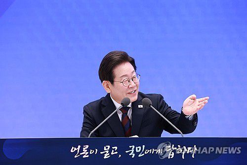 이재명 대통령, 취임 30일 기자회견(서울=연합뉴스) 홍해인 기자 = 이재명 대통령이 3일 청와대 영빈관에서 열린 '대통령의 30일, 언론이 묻고 국민에게 답하다' 기자회견에서 발언하고 있다.  2025.7.3 hihong@yna.co.kr