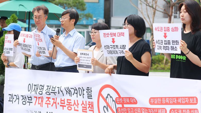 ▲ 지난달 30일 참여연대 회원들이 '이재명 정부가 새겨야 할 과거 정부의 7대 주거·부동산 실책 발표 기자회견'을 하고 있다.