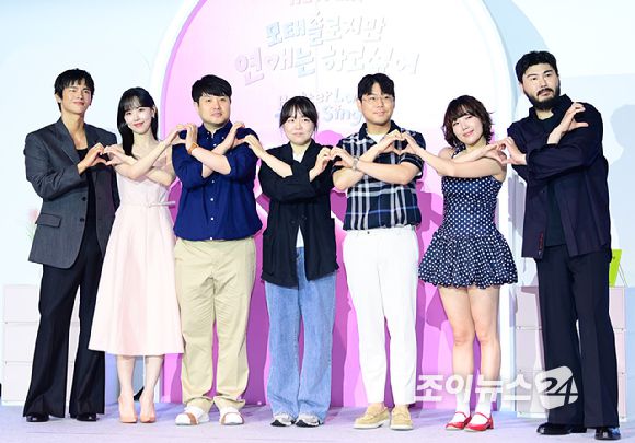 (왼쪽부터)서인국-강한나-조욱형 PD-김노은 PD-원승재 PD-이은지-카더가든이 3일 오전 서울 용산구 CGV 용산아이파크몰에서 열린 넷플릭스 새 연애 리얼리티 예능 '모태솔로지만 연애는 하고 싶어' 제작발표회에 참석하고 있다. [사진=정소희 기자]