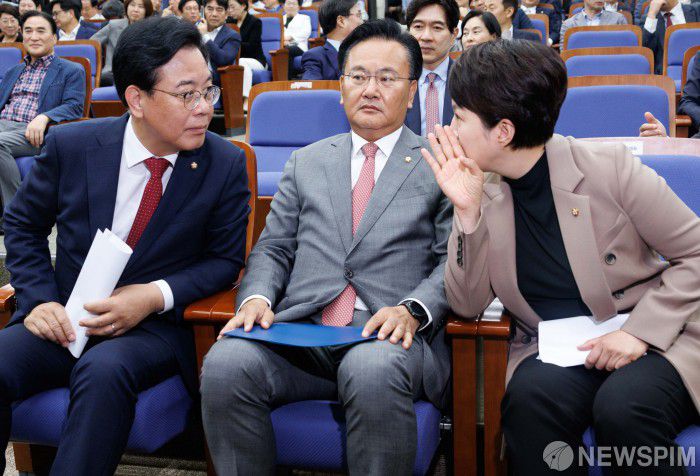 [서울=뉴스핌] 윤창빈 기자 = 송언석 국민의힘 비상대책위원장 겸 원내대표, 유상범 원내수석부대표, 김은혜 원내정책수석부대표가 3일 오전 서울 여의도 국회에서 열린 의원총회에서 대화를 나누고 있다. 2025.07.03 pangbin@newspim.com