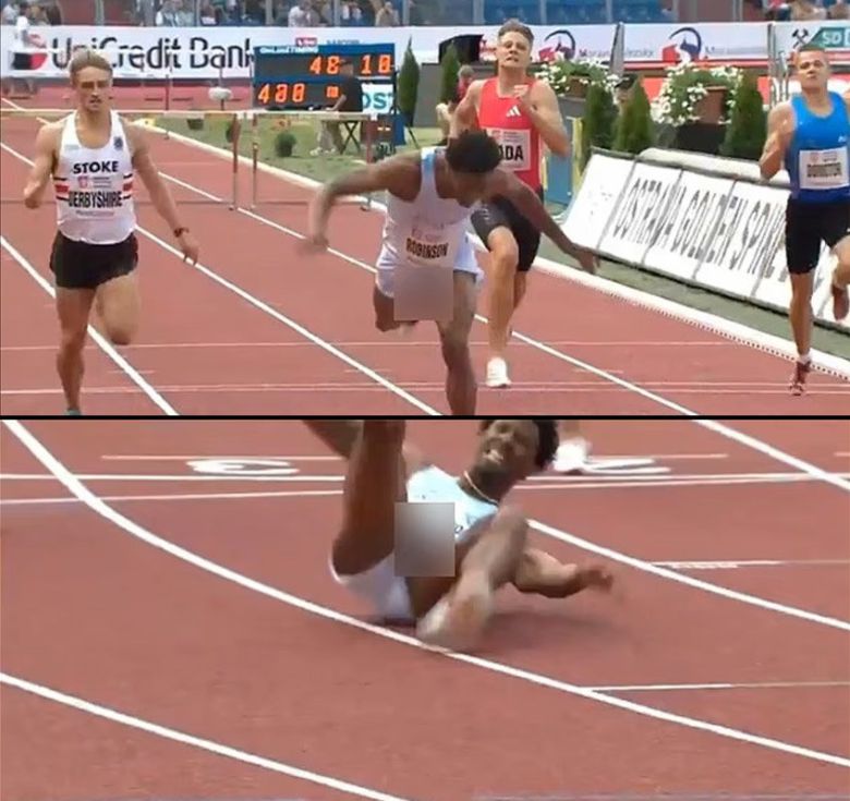 29일(현지시간) 영국 데일리메일에 따르면, 최근 체코 오스트라바에서 열린 골든 스파이크 대회 400m 허들 경기에서 미국 육상 선수 크리스 로빈슨이 신체 특정 부위가 노출되는 상황을 겪었다.