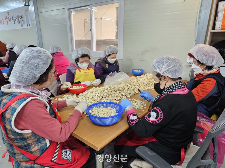 충북 청주시 상당구 석교동 육거리 종합시장 인근 ‘일하는 밥퍼’ 사업장에서 노인들이 마늘을 손질하고 있다. 이삭 기자. |