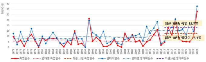 1973∼2024년 연간 폭염일수와 열대야일수는 각각 10년당 1.2일, 2.3일로 증가 추세에 있다.