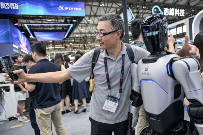 18일 상하이 신국제엑스포센터에서 열린 모바일 월드 콩그레스(MWC)에서 한 남성이 지위안(Zhiyuan)사의 로봇(애지봇)과 셀카를 찍고 있다. /AFPBBNews=뉴스1