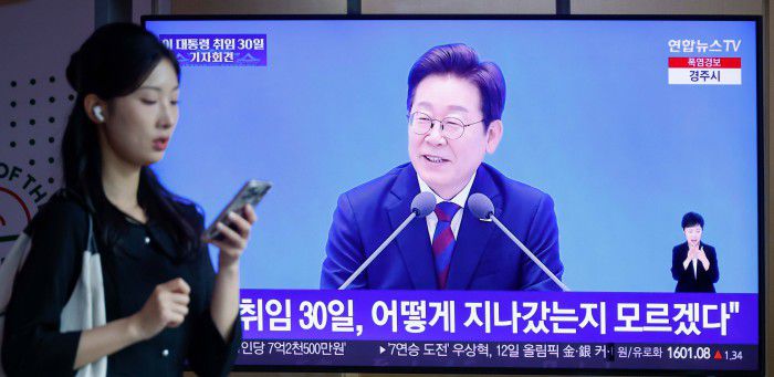 [서울=뉴스핌] 류기찬 인턴기자 = 3일 오전 서울역 대합실에서 시민들이 이재명 대통령의 취임 30일 기자회견을 시청하고 있다. |