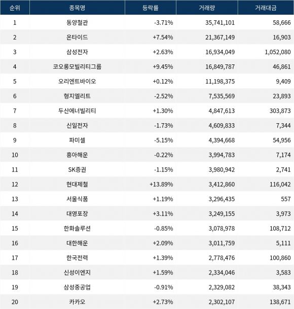 한편 거래량 상위 20위권 종목들은 SK증권(001510) ▼1.15%, 현대제철(004020) ▲13.89%, 서울식품(004410) ▲1.19%, 대영포장(014160) ▲3.11%, 한화솔루션(009830) ▼0.85%, 대한해운(005880) ▲2.09%, 한국전력(015760) ▲1.39%, 신성이엔지(011930) ▲1.59%, 삼성중공업(010140) ▼0.91%, 카카오(035720) ▲2.73% 등의 성적을 기록했다.
