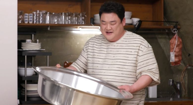 김준현은 압도적 사이즈의 초대형 대야를 꺼냈다. 키 180cm, 체중 117kg 김준현의 상반신을 가릴 정도로 큰 대야였다. 이를 본 MC 붐 지배인은 "우리 딸 목욕시키는 욕조 사이즈"라며 혀를 내둘렀다. 요리한다더니 대야를 꺼내 궁금증이 커진 가운데 김준현은 "김치말이국수 20인분 잔뜩 만들어서 다 같이 먹읍시다, 개운하게 마무리"라고 외쳤다.