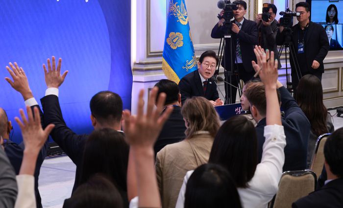 이재명 대통령이 3일 청와대 영빈관에서 열린 '대통령의 30일, 언론이 묻고 국민에게 답하다' 기자회견에서 기자들의 질문을 받고 있다.(사진=연합뉴스)