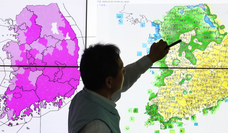 | 전국 대부분 지역에 폭염 특보가 내려진 3일 경기도 수원시 권선구 수도권기상청에서 예보관이 특보 발효 상황 등을 설명하고 있다. / 사진=연합뉴스 |
