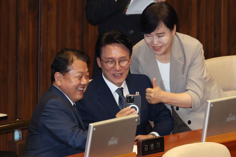 김민석 국무총리 후보자가 3일 오후 서울 여의도 국회에서 열린 본회의에서 김병주,전현희 더불어민주당 의원과 기념촬영을 하고 있다./뉴스1 |